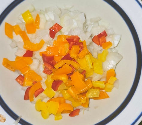 Dice the onion, and the peppers. (See photo 2 for the relative quantities.)