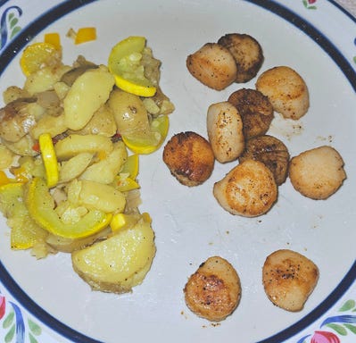 A 1-1/2 lb. bag of scallops had 51 scallops in it. I had calculated 10 per serving, and I was planning on feeding 2 adults for 2 meals, with a few extra to have with my scrambled eggs for breakfast. The quantities of scallops and veggies lasted for 2 evening’s suppers, and 2 morning’s breakfast. (But I wish I had more!)