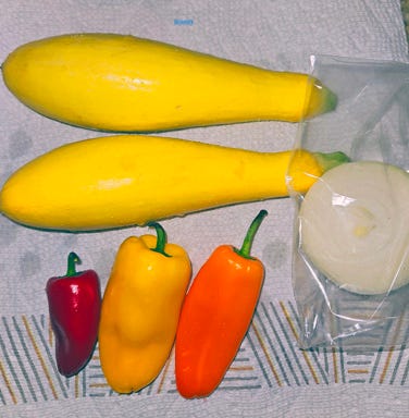 While scallops can go with so many different things, here I’ve paired them with fresh, healthy veggies that can be sourced from your garden or anywhere. We’ve got ‘taters, yellow squash, baby bell peppers and onion.